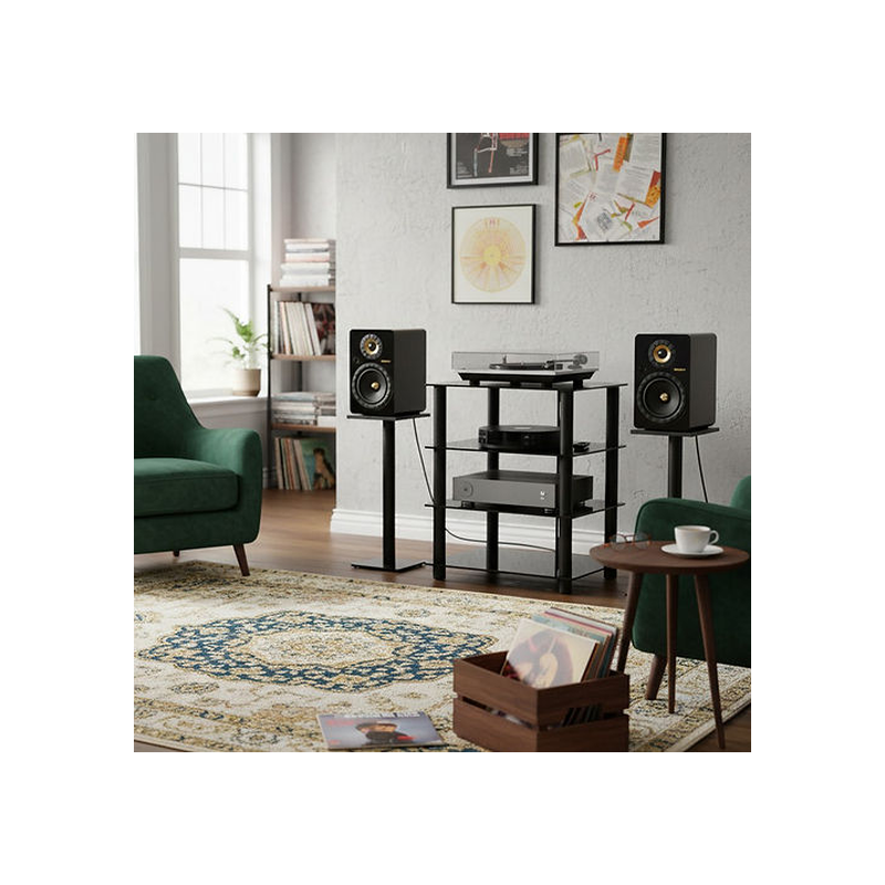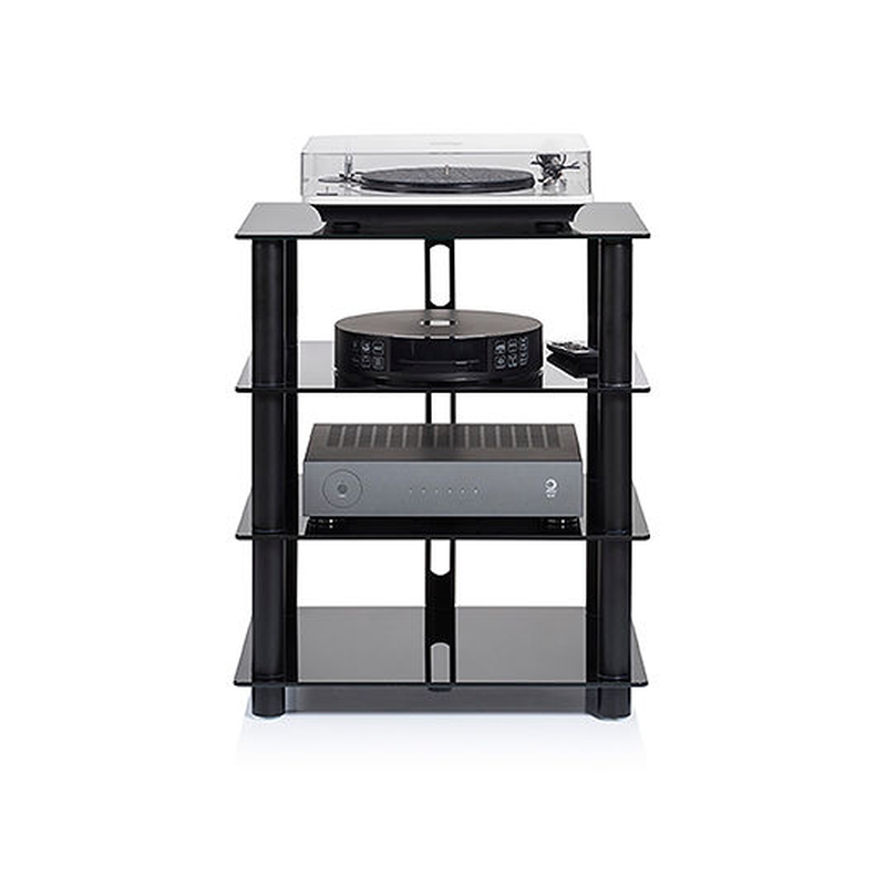Meuble hi-fi moderne à structure acier et plateaux en verre, assurant stabilité et isolation des vibrations.