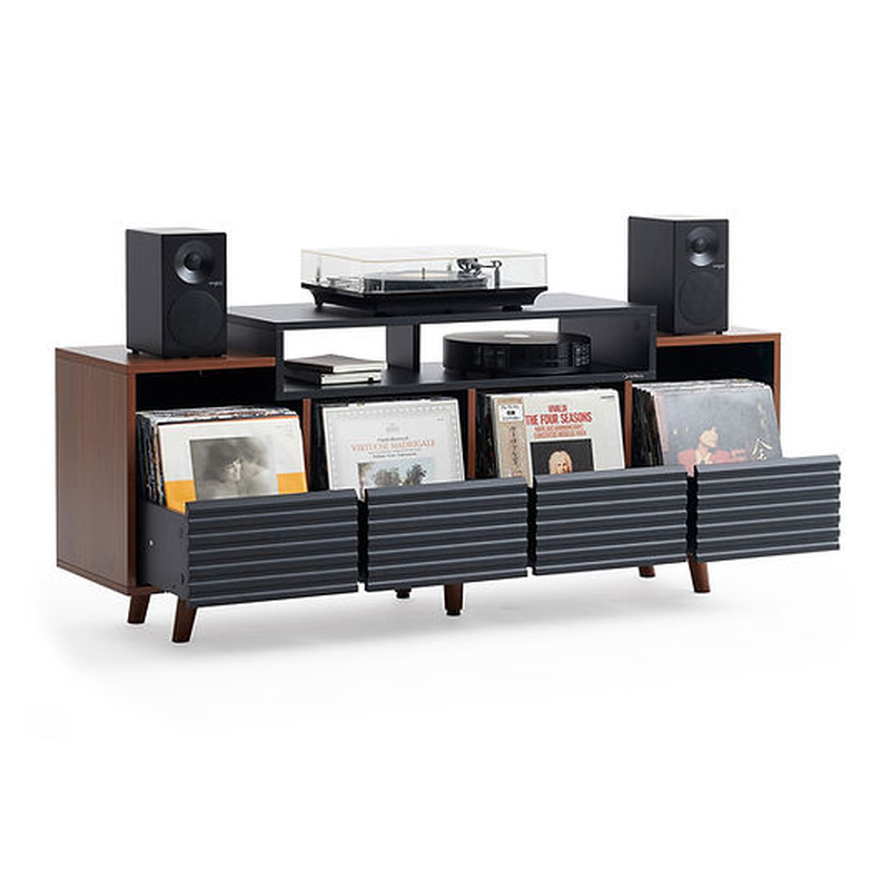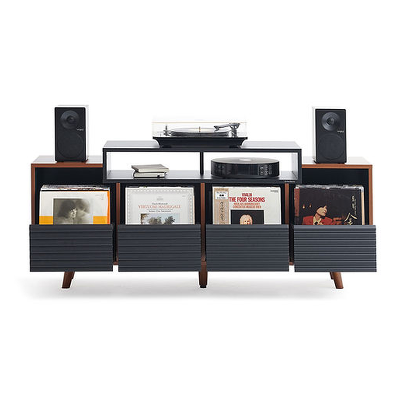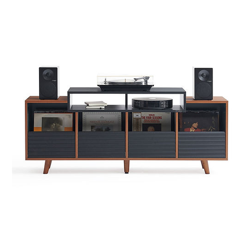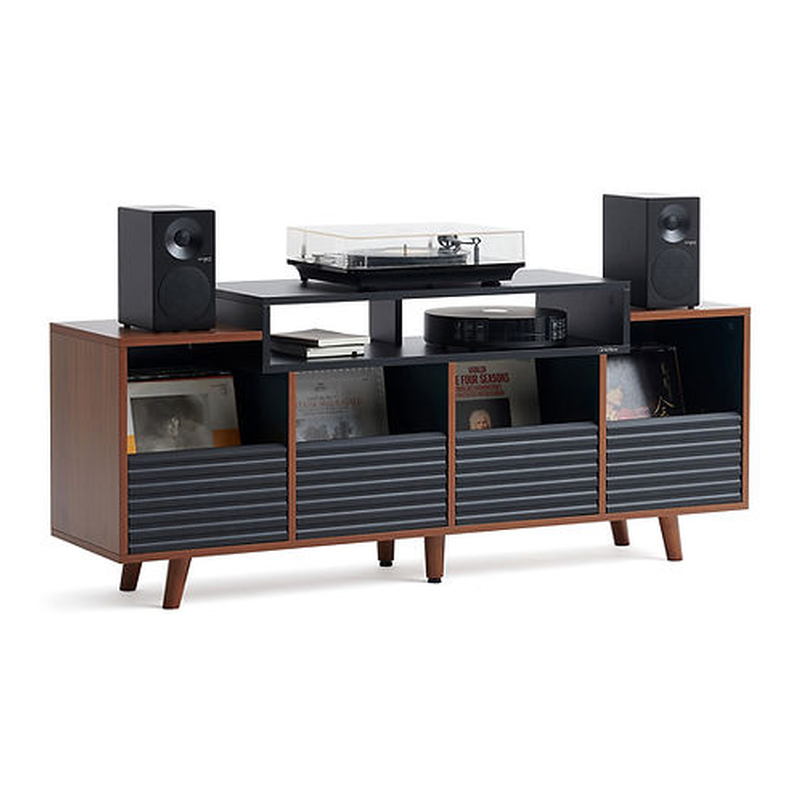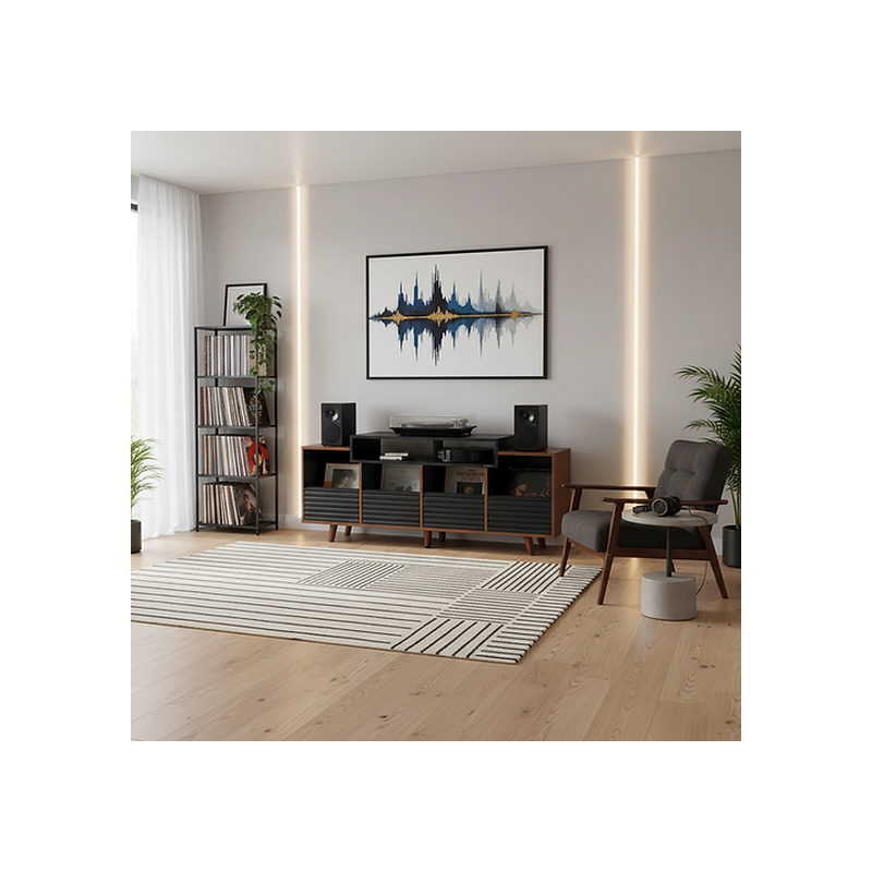 Meuble audio-vidéo grand format au design scandinave, conçu pour accueillir de grands téléviseurs et des installations complètes.
