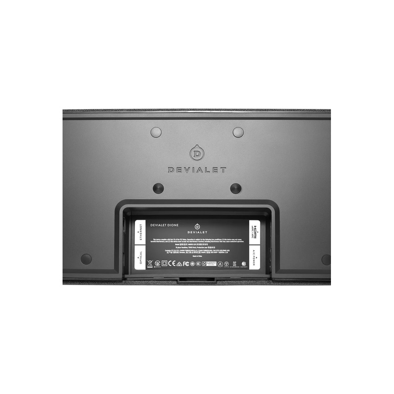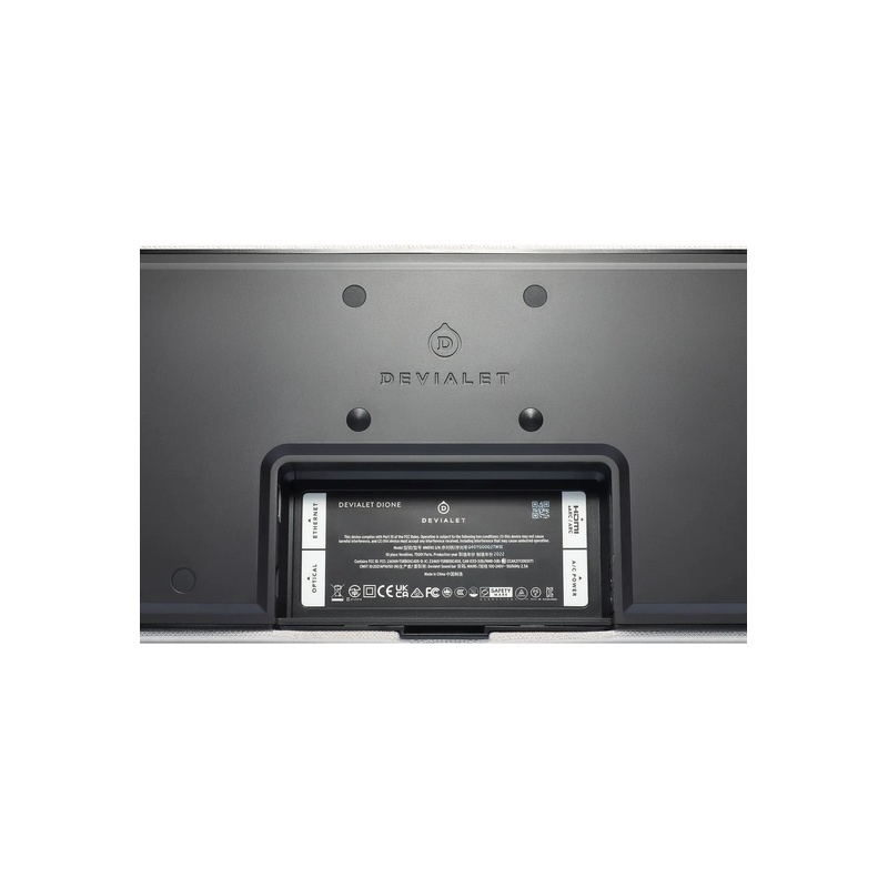 Les haut-parleurs de la barre de son Devialet Dione sont agencés selon le principe ADE (Advanced Dimensional Experience) et associés à des filtres numériques pour optimiser la spatialisation des différents canaux. Grâce à la technologie Devialet Space, la barre de son Devialet Dione est capable de virtualiser un programme stéréo ou 5.1 sur un ensemble de 5.1.2 canaux afin d’assurer une écoute enveloppante avec tout contenu. La barre de son Devialet Dione profite également du système AVL pour effectuer une égalisation dynamique en temps réel afin que chaque détail sonore soit parfaitement compréhensible par le spectateur. Enfin, le système de calibrage avec microphone permet d’optimiser la restitution de la Devialet Dione en fonction de la pièce d’écoute